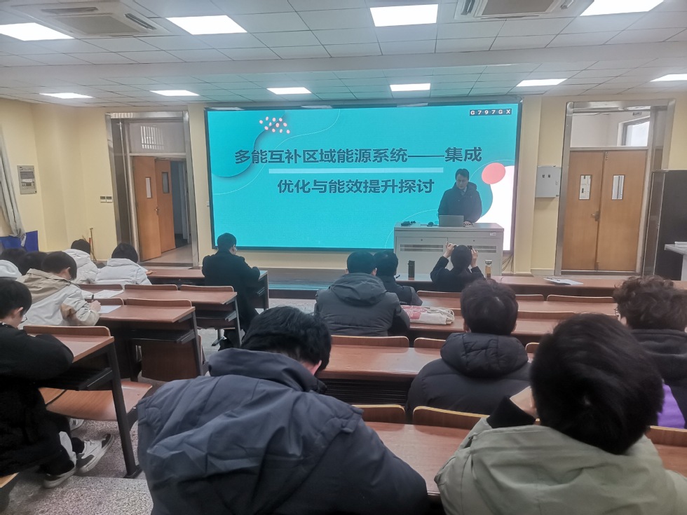 讲座以“多能互补区域能源系统集成优化及能效提升关键技术探讨”为主题,吴东兴结合国家“双碳”战略,解析能源协同优化、梯级利用、多能互补等关键技术,分享标杆项目实践经验,指明行业去中心化、智能化、清洁化发展趋势,内容兼具理论与实践价值,互动环节解答师生疑问,氛围热烈。