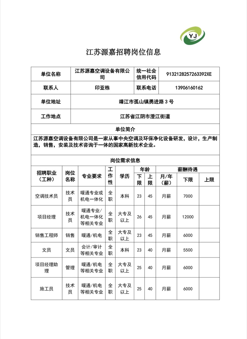 招聘速递[2026043]江苏源嘉空调设备有限公司招聘